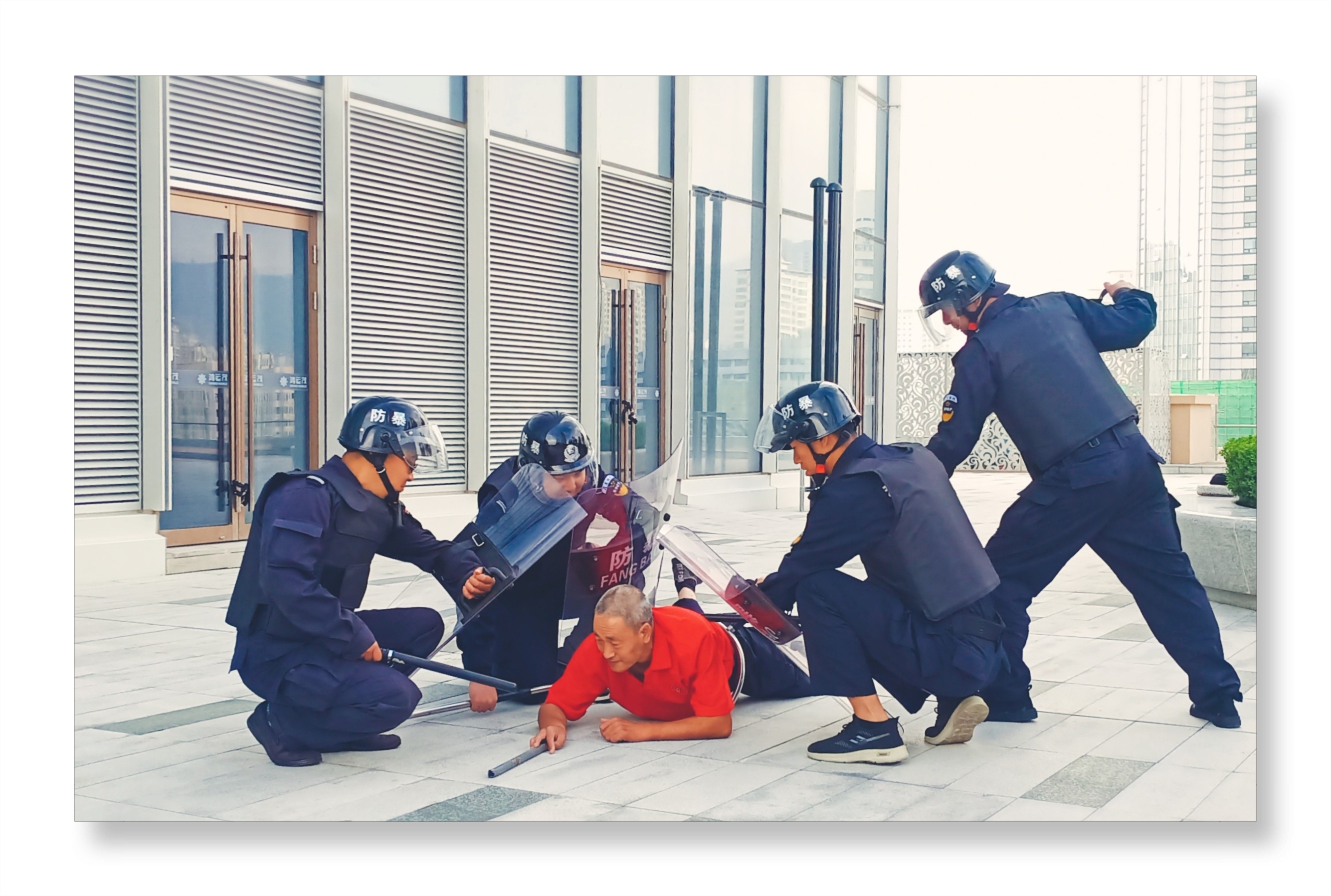 在反恐防暴方面,安保队开展常态化防暴应急演练,模拟“暴徒”强行闯入场景,实战操练防暴盾牌、钢叉等器材使用,提升化险的快速反应能力。