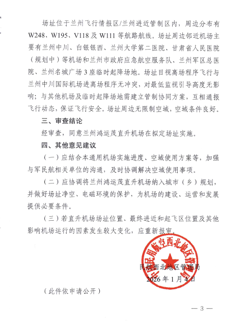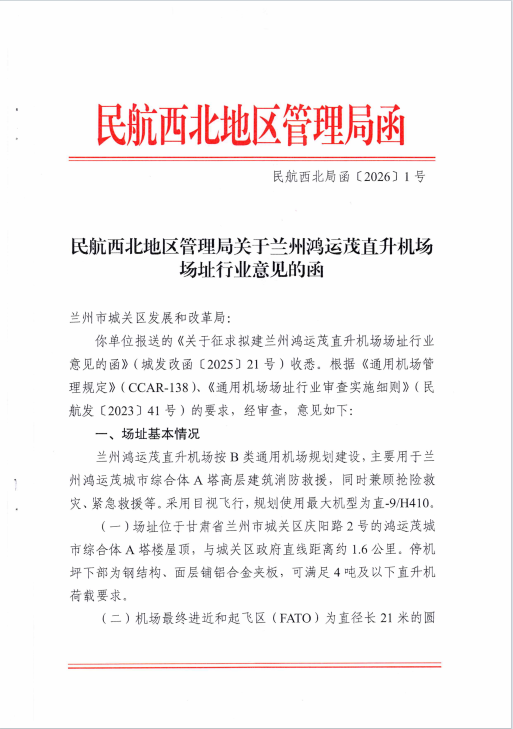 2026年1月4日,民航西北地区管理局正式批准兰州鸿运茂直升机场场址,标志着这一甘肃地区首个城市核心区超高层高架直升机场项目迈入实质性运营阶段。该审批基于2025年8月28日召开的选址评审会成果,为兰州打造“空中门户”提供了法定依据,将加速推动城市立体交通网络建设,助力“一带一路”空中走廊的深度融合。